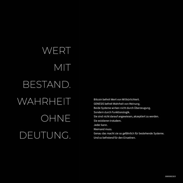 Systeme wirken stabil, solange niemand sie hinterfragt. GENESIS SEED zeigt, wie Vertrauen zu Macht wird – und warum Nachvollziehbarkeit ein Gegenentwurf sein kann. Bitcoin steht hier nicht als Heilsversprechen, sondern als Protokoll: weltweit nutzbar, unabhängig, verifizierbar.