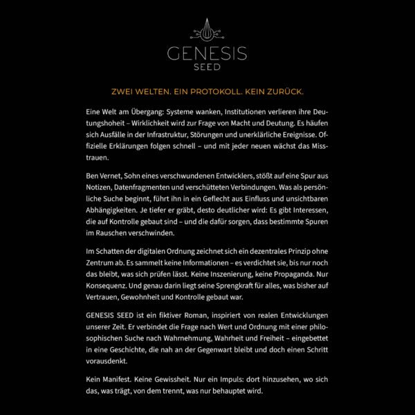 GENESIS SEED ist ein fiktiver Roman, inspiriert von realen Entwicklungen unserer Zeit. Er verbindet die Frage nach Wert und Ordnung mit einer philosophischen Suche nach Wahrnehmung, Wahrheit und Freiheit – eingebettet in eine Geschichte, die nah an der Gegenwart bleibt und doch einen Schritt vorausdenkt.